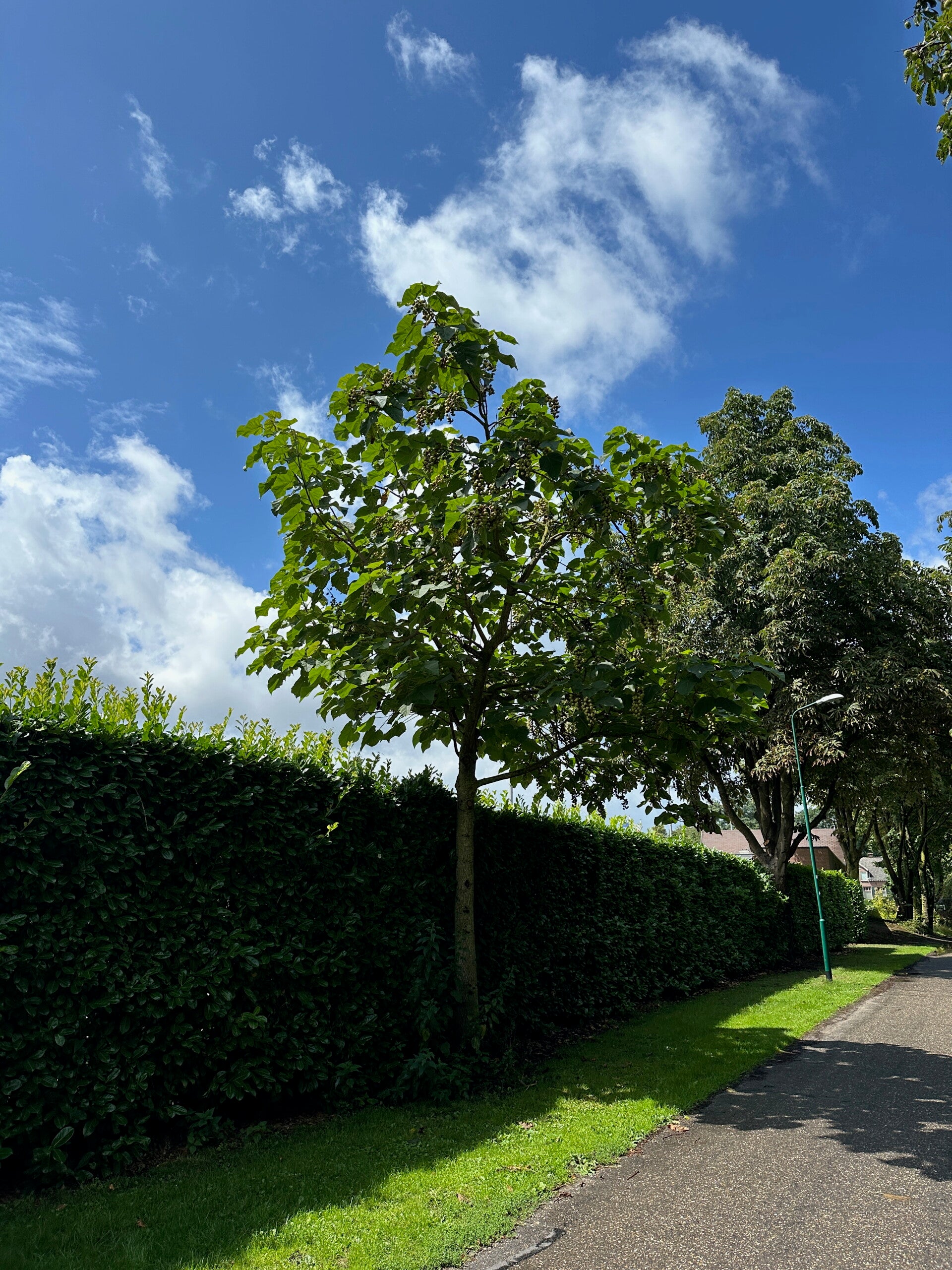 Deze prachtige Japanse zelkova staat verscholen in het park in het Ruisseveen, ter hoogte van de woningen aan het Wagnerpad. De boom valt op door zijn sierlijke vorm en fraaie bast. In de herfst kleurt het blad spectaculair geel, oranje en rood – een echte blikvanger in het najaar.